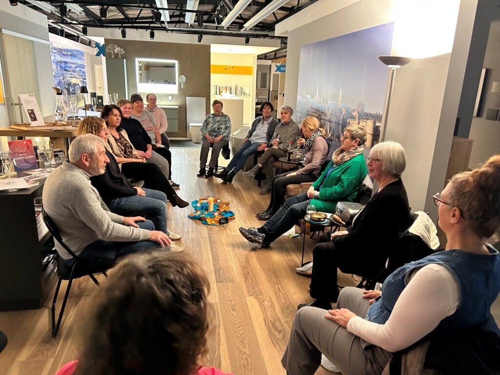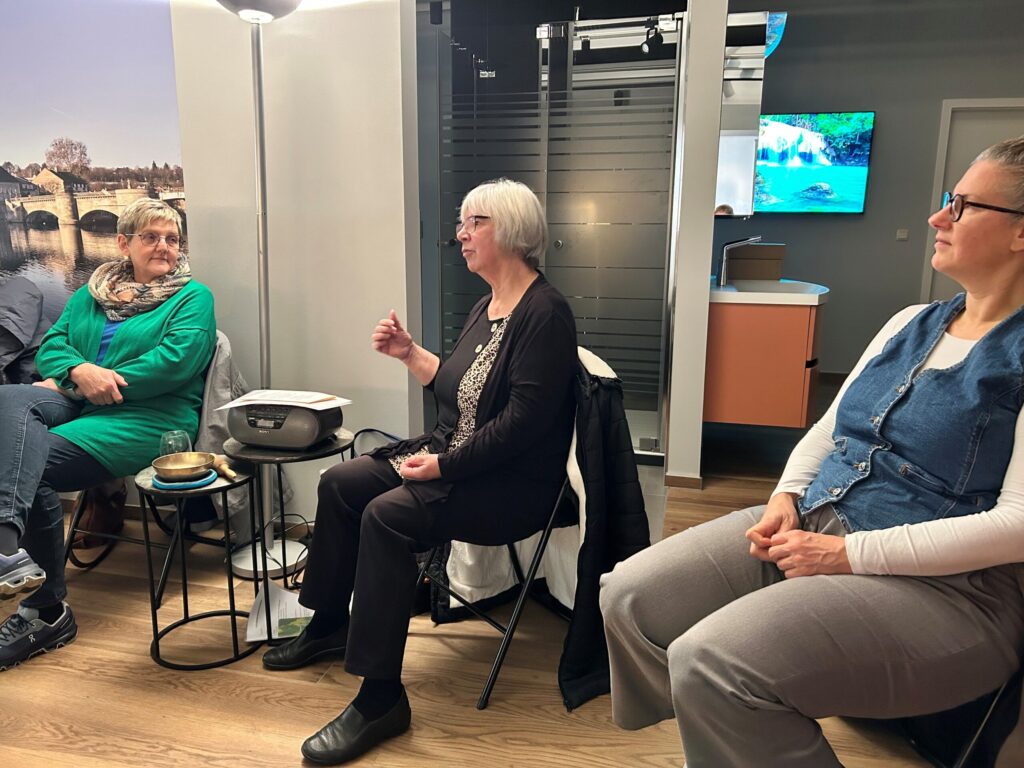 Oft fühlen sich Trauernde nach dem Tod eines nahestehenden Menschen alleingelassen mit ihren Gefühlen, ihrem Schmerz und ihrer Trauer. Das Reden über Tod und Sterben scheint in unserer Gesellschaft immer weniger erwünscht zu sein. Angela Keck, Anleiterin in christlicher Meditation, Hospiz- und Trauerbegleiterin sowie Geistliche Begleiterin hat uns angenehm und behutsam in den Themenkomplex eingeführt, uns in ihr schon knapp 20jähriges Tun und Wirken mitgenommen und uns Körperwahrnehmungsübungen und Sitzen in der Stille gezeigt, um mit einem biblischen Impuls auf einen guten Übungsweg zu kommen, um Gottes Nähe zu spüren, Trost zu suchen und zu finden.