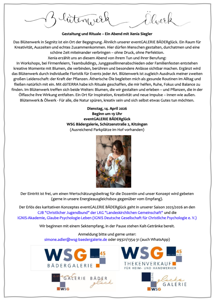 eventGALERIE BÄDERglück – Herzliche Einladung zu Gestaltung und Rituale – Ein Abend mit Xenia Siegler